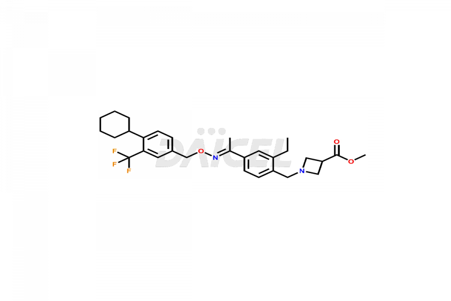 The chemical name of Siponimod is 1-[[4-[(1E)-1-[[[4-Cyclohexyl-3-(trifluoromethyl)phenyl]methoxy]imino]ethyl]-2-ethylphenyl]methyl]-3-azetidinecarboxylic acid. Its chemical formula is C29H35F3N2O3, and its molecular weight is approximately 516.6 g/mol.