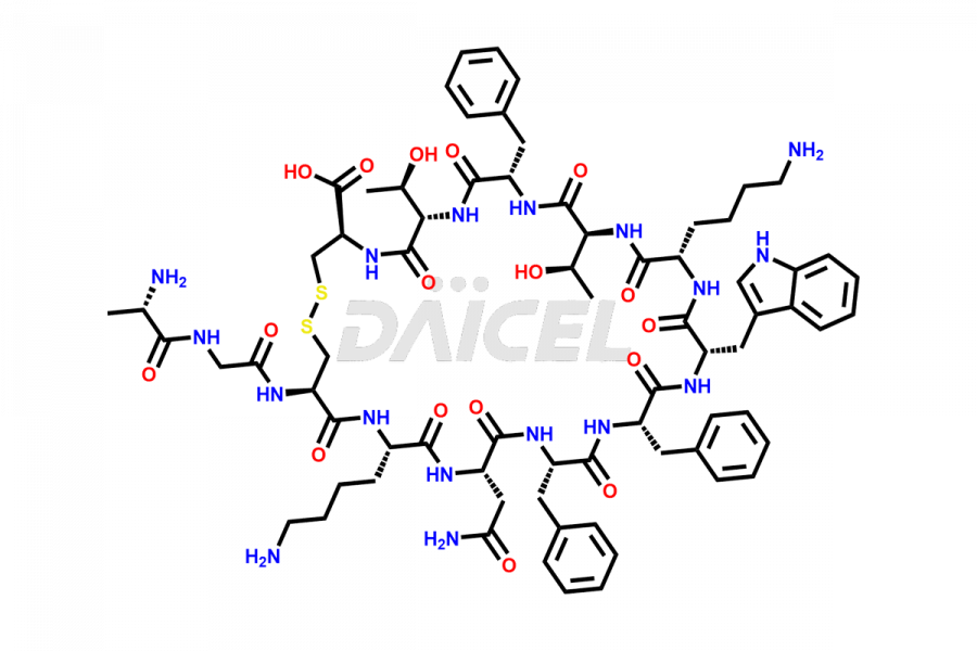 Daicel Pharma synthesizes more than twenty-five high-quality Somatostatin impurities, such as D-Ala(1)-Somatostatin, D-Asn(5)-Somatostatin, D-Cys(3)-Somatostatin, D-Lys(4)-Somatostatin, D-Phe(6)-Somatostatin, D-Cys(14)-Somatostatin, [3-14]-Somatostatin, Di-Trp(8)-Somatostatin, Endo [Ser-Cys(Acm)]-Somatostatin, and more, crucial in determining the quality, stability, and biological safety of the active pharmaceutical ingredient, Somatostatin. Moreover, Daicel Pharma offers custom synthesis of Somatostatin impurities and delivers them globally.