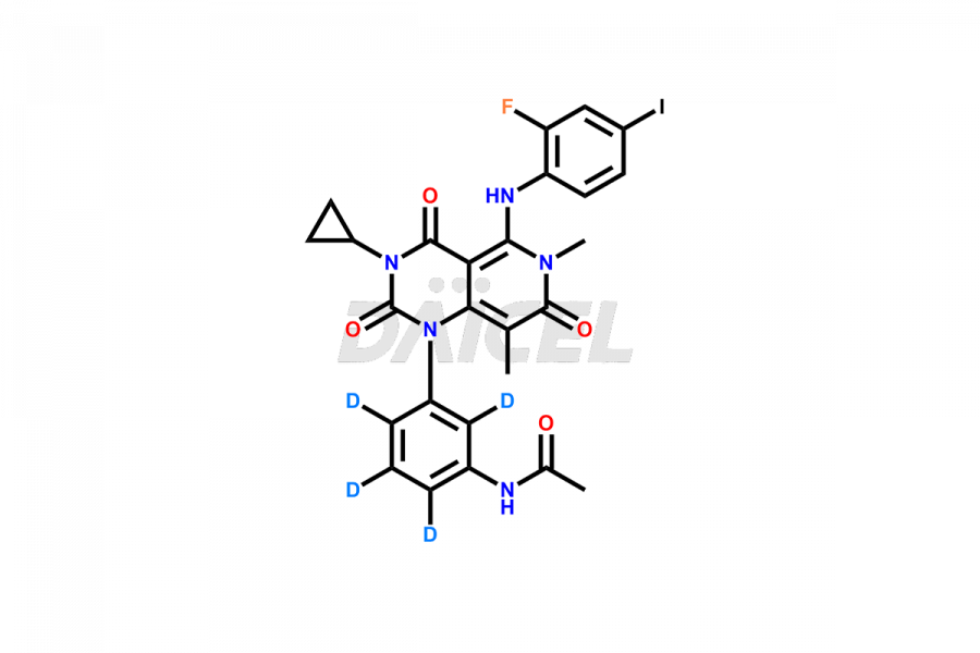 The chemical name of Trametinib is N-[3-[3-Cyclopropyl-5-[(2-fluoro-4-iodophenyl)amino]-3,4,6,7-tetrahydro-6,8-dimethyl-2,4,7-trioxopyrido[4,3-d]pyrimidin-1(2H)-yl]phenyl]acetamide. Its chemical formula is C26H23FIN5O4, and its molecular weight is approximately 615.4 g/mol.