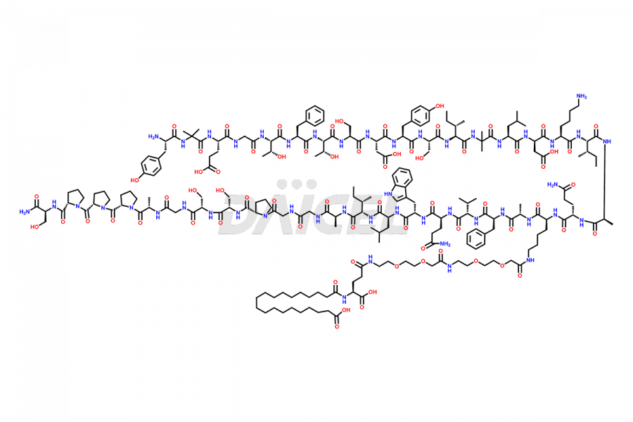 | IUPAC NAME | H-Tyr-Aib-Glu-Gly-Thr-Phe-Thr-Ser-β-Asp-Tyr-Ser-Ile-Aib-Leu-Asp-Lys-Ile-Ala-Gln-Lys(AEEAc-AEEAc-γ-Glu-18-carboxy nonadecanoyl)-Ala-Phe-Val-Gln-Trp-Leu-Ile-Ala-Gly-Gly-Pro-Ser-Ser-Gly-Ala-Pro-Pro-Pro-Ser-NH2 |