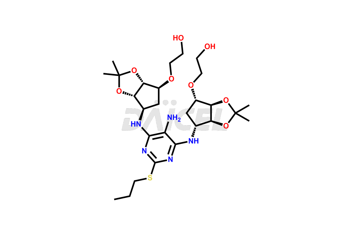 | IUPAC Name | 2,2'-(((3aR,3a'R,4S,4'S,6R,6aS,6'R,6a'S)-((5-amino-2-(propylthio)pyrimidine-4,6-diyl)bis(azanediyl))bis(2,2-dimethyltetrahydro-4H-cyclopenta[d][1,3]dioxole-6,4-diyl))bis(oxy))bis(ethan-1-ol) |