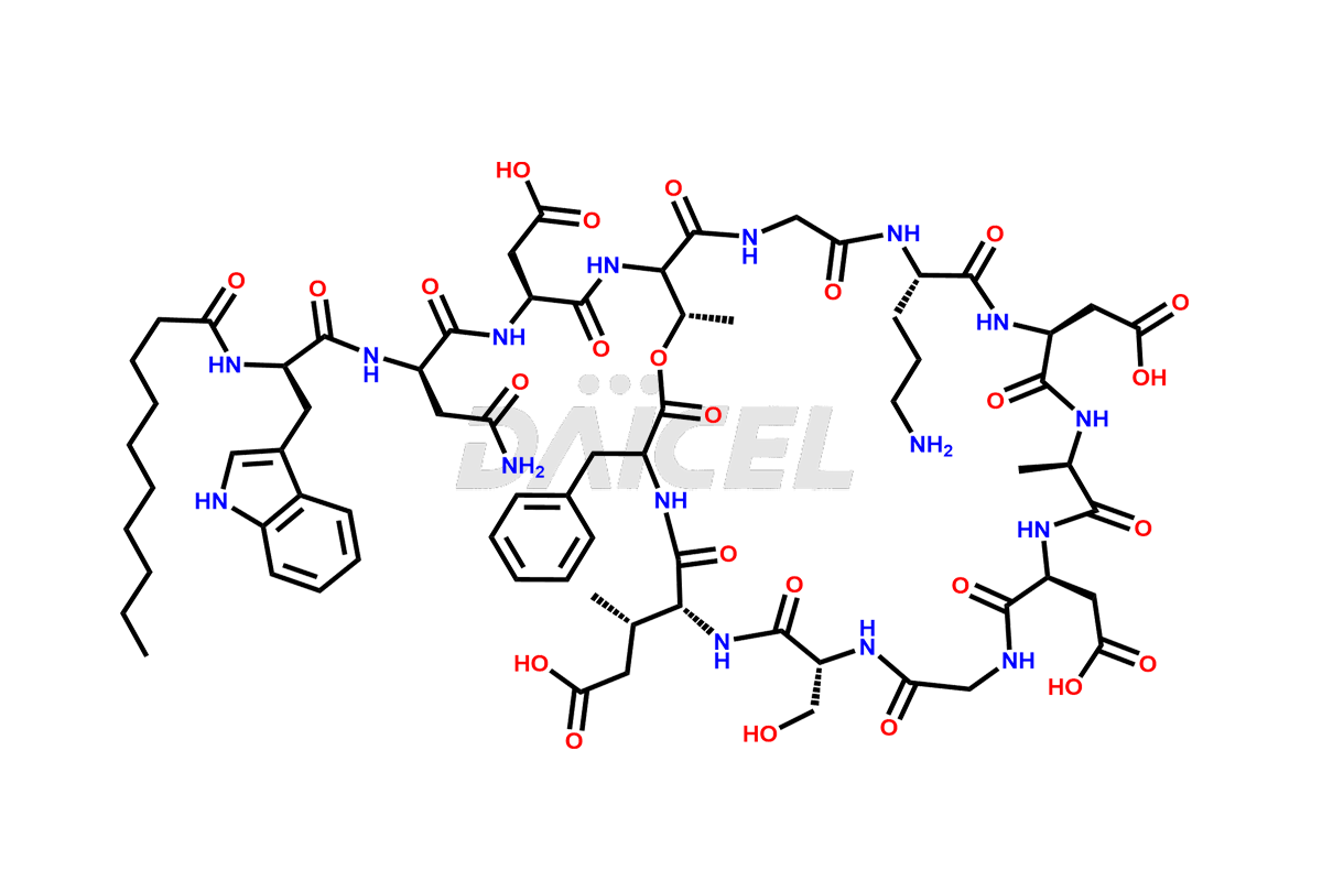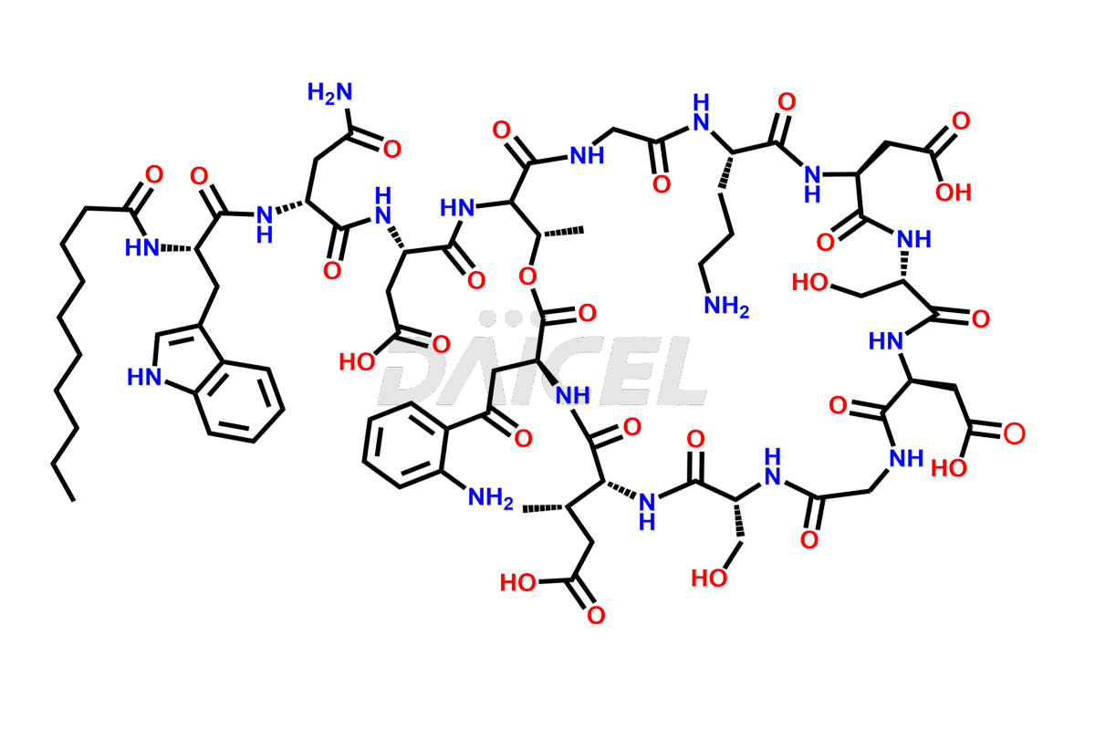 | IUPAC NAME | N-decanoyl-Trp-D-Asn-Asp-Thr-Gly-Orn-Asp-D-Ser-Asp-Gly-D-Ser-3Me-Glu-Kyn-OH (ε1-lactone) |
