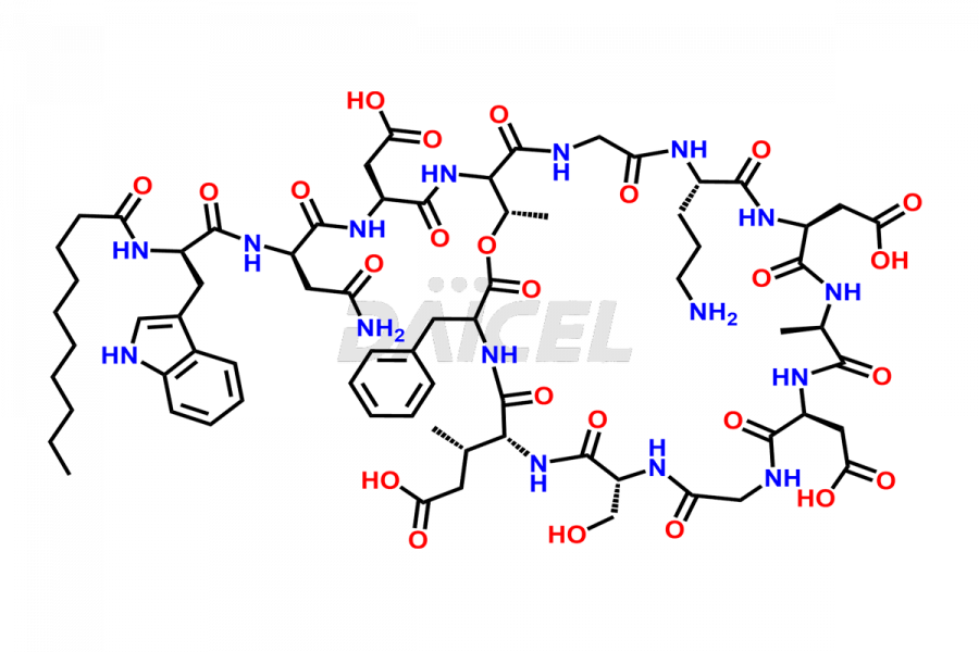 | IUPAC NAME | N-decanoyl-Trp-D-Asn-Asp-Thr-Gly-Orn-Asp-D-Ala-Asp-Gly-D-Ser-3Me-Glu-Phe-OH (ε1-lactone) |