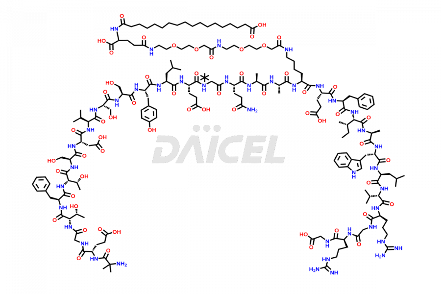 | IUPAC NAME | H-Aib-Glu-Gly-Thr-Phe-Thr-Ser-Asp-Val-Ser-Ser-Tyr-Leu-Glu-Gly-Gln-Ala-Ala-Lys (AEEAc-AEEAc-γ-Glu-17-carboxy heptadecanoyl)-Glu-Phe-Ile-Ala-Trp-Leu-Val-Arg-Gly-Arg-Gly-OH |
