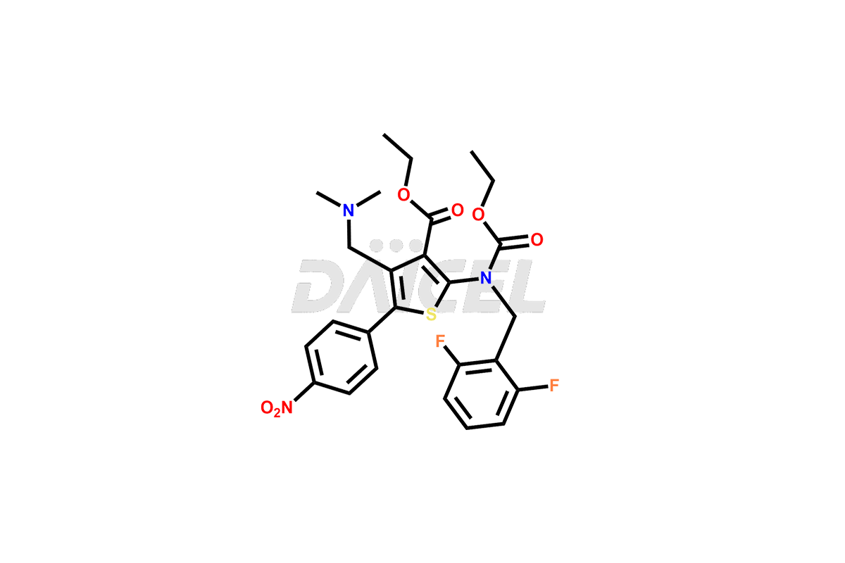 | IUPAC NAME | ethyl 2-((2,6-difluorobenzyl) (ethoxycarbonyl)amino)-4-((dimethylamino)methyl)-5-(4-nitrophenyl) thiophene-3-carboxylate |