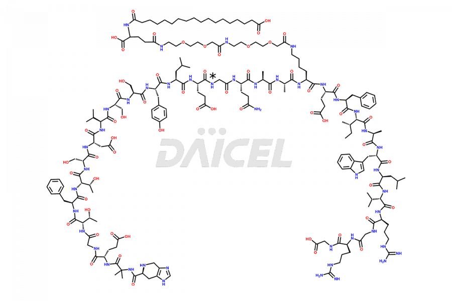 | IUPAC NAME | Cyclic-His-Aib-Glu-Gly-Thr-Phe-Thr-Ser- -Asp-Val-Ser-Ser-Tyr-Leu-Glu-Gly-Gln-Ala-Ala-Lys -(AEEAc-AEEAc-γ-Glu-17-carboxy heptadecanoyl)-Glu-Phe-Ile-Ala-Trp-Leu-Val-Arg-Gly-Arg-Gly-OH |