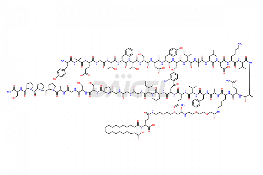 | IUPAC NAME | H-Tyr-Aib-Glu-Gly-Thr-Phe-Thr-Ser-Asp-Tyr-Ser-Ile-Aib-Leu-Asp-Lys-Ile-Ala-Gln-Lys(AEEAc-AEEAc-γ-Glu-18-carboxy nonadecanoyl)-Ala-Phe-Val-Gln-Kyn-Leu-Ile-Ala-Gly-Gly-Pro-Ser-Ser-Gly-Ala-Pro-Pro-Pro-Ser-NH2 |