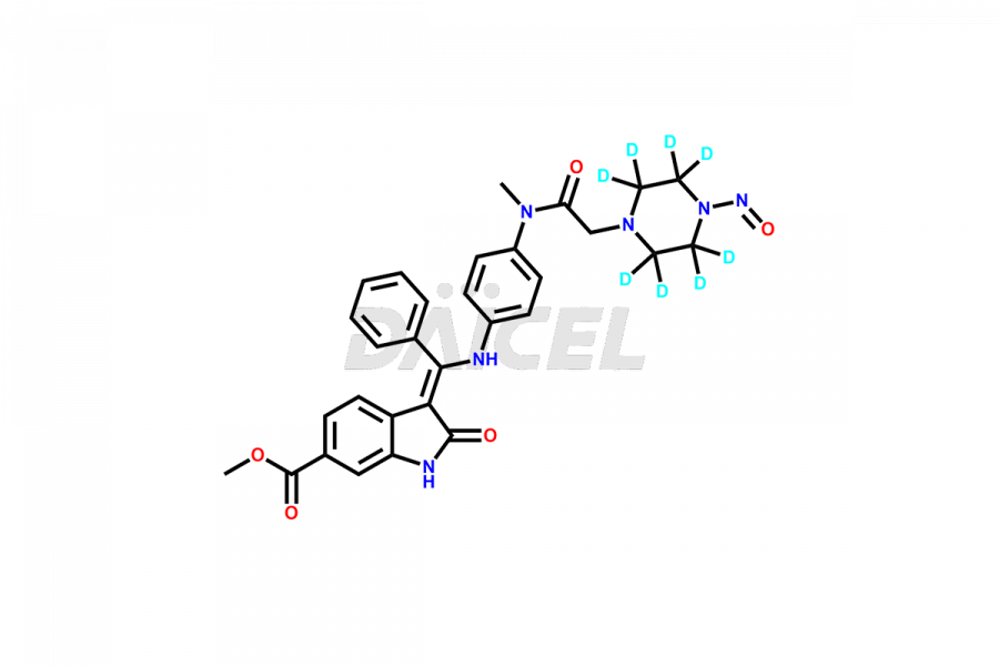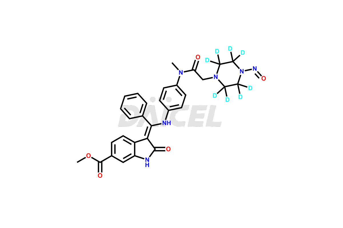 | IUPAC NAME | methyl (Z)-3-(((4-(N-methyl-2-(4-nitrosopiperazin-1-yl-2,2,3,3,5,5,6,6-d8)acetamido)phenyl)amino)(phenyl)methylene)-2-oxoindoline-6-carboxylate |